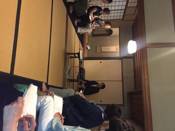 菓子の起源、神饌、食と芸能、ホストとゲストの関係など古代から現代まで、あるいは日本全国の伝承や海外でのパフォーマンスまで幅広い文化のお話しをうかがいました。有斐斎弘道館の数寄屋建築、庭園だけでなく、さまざまな室内の調度、掛け軸なども見学させていただくなかに京のしつらい、客迎えの心得の一端を学ぶことができました。