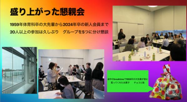 講演会終了後の懇親会盛り上がりました。20人を超える支部会員の参加は想像以上の人数でした。1959年卒の大先輩から2024年卒の新人会員まで幅広い参加でグループを5つに分けて満足度の高い懇談を目指しました。途中ブレイクタイムでレクレーションを行いました。1959年体育科卒の大先輩がみんなにお菓子を用意してくださりこれを使い楽しみました。
