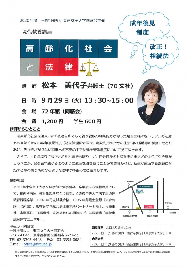 ■弁護士 松本美代子(同窓生) 超高齢化社会を迎え、私たち自身、また親や親族の判断能力が劣った場合に起きる様々なトラブルを防ぐための成年後見制度を取り上げます。また、2020年4月の相続法改正も取り上げ、私たちが直面する課題について詳しく、わかりやすく、お話しします。