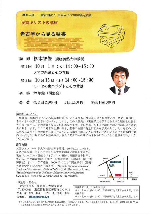 後期キリスト教講座 「考古学から見る聖書」 第2回 10月15日(木) モーセの出エジプトとその背景 14時~15時30分 ■講師:杉本智俊 慶応義塾大学教授(考古学) この講座では、ノアの箱舟と出エジプトという比較的一般の方々にもなじみのある物語を最近の考古学的研究で明らかになってきた聖書の物語の背景にどんな状況があり、それをどのように表現しようとしたのかをご紹介します。
