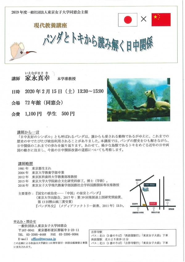 現代教養講座「パンダとトキから読み解く日中関係」 今、中国が注目を集めています。「パンダとトキ」から今後の日中関係について学びましょう。 ■講師:家永真幸本学准教授 2018年度第39回発展途上国研究奨励賞&第13回樫山純三賞受賞