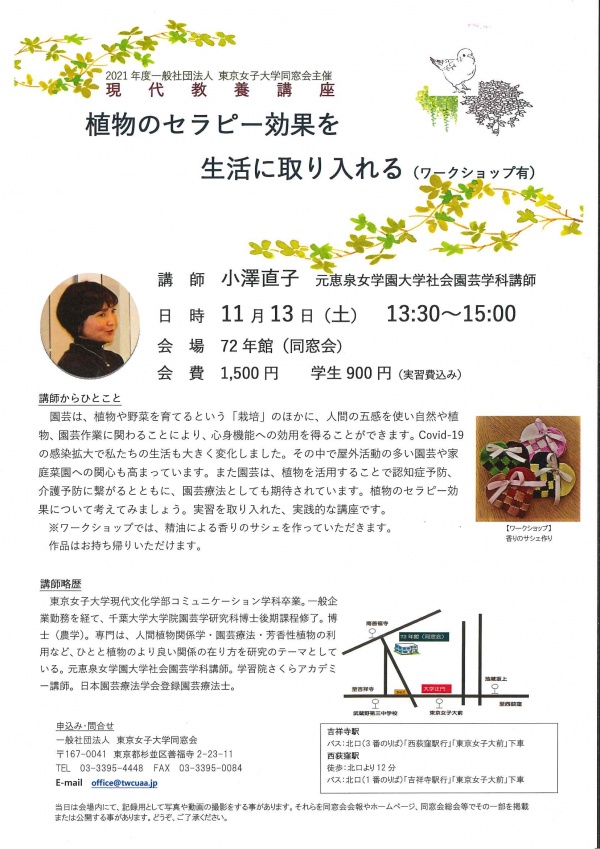 認知症予防や介護予防につながると期待される園芸療法。植物のもつセラピー効果について、コロナ禍のことも交えてお話いただきます。ワークショップとしてサシェを作成します。 ■講師:小澤直子(同窓生)