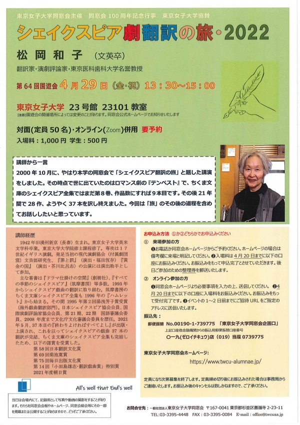 ■講師:松岡和子(同窓生) 2021年5月シェイクスピアの37本の戯曲すべてを翻訳された松岡先生。「シェイクスピアの広報担当」を自認する先生から、今まで取り組んできたことと、これからのことを伺います。2021年度朝日賞受賞。 会場、オンラインともに受付終了