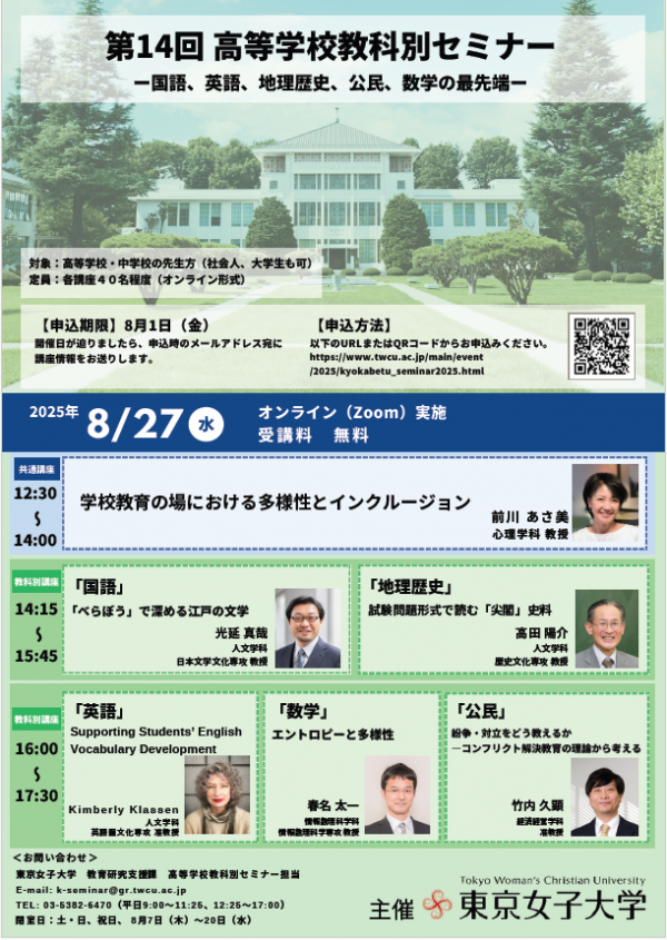東京女子大学現代教養学部は、人文、国際社会、経済経営、心理、社会コミュニケーション、情報数理科学の各学科・研究分野を専門とする教員を擁しております。本学教員の最新の研究成果や教育経験を中学・高校の先生方に公開し、教育への新たな視点を提供することを目標として、第14回教科別セミナーを開催いたします。今年度は教科別講座(国語、英語、地理歴史、公民、数学)及び教科横断型の共通講座をオンライン形式で開講します。