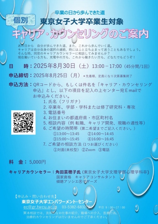 【日 時】:2025年8月30日(土)13時~17時 【開催方法】:対面(来校)、またはオンライン(Zoom/電話) 【対 象】:卒業生 【カウンセラー】:角田菜穂子氏(卒業生・国家資格キャリアコンサルタント)